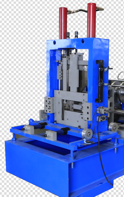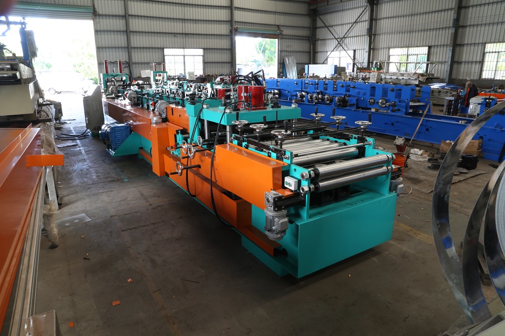 Máquina formadora → Cortador de poste hidráulico → Rack de salida.